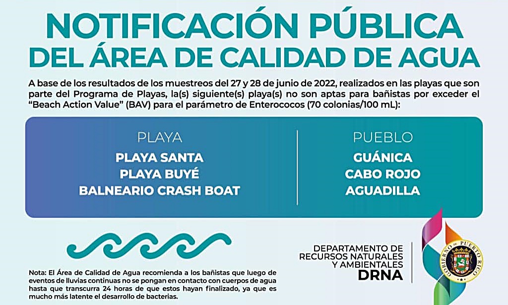 Buyé, Playa Santa y Crash Boat no aptas para bañistas este fin de semana