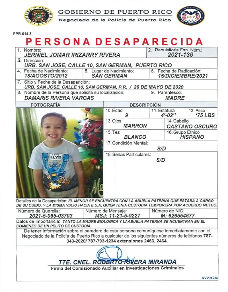 El informe enviado por la agente Natalie Guadalupe, de la Oficina de Prensa de la Policía de Mayagüez, indica que Jerniel Jomar Irizarry Rivera, de 9 años, el menor se encuentra con la abuela paterna, quien estaba a cargo de su cuido.
