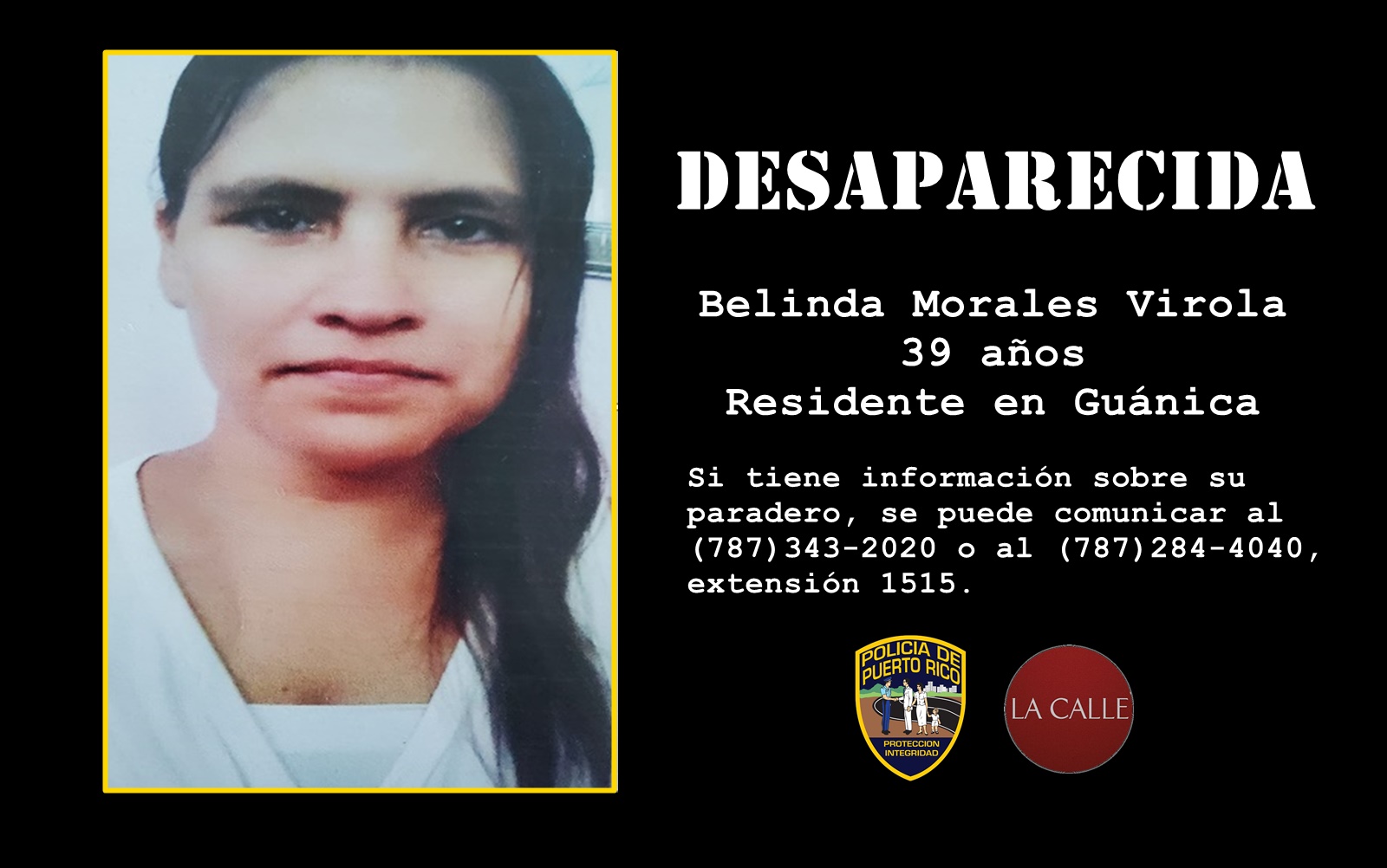 Las personas que puedan tener información sobre el paradero de Belinda Morales Virola se pueden comunicar al (787) 343-2020 o a la Comandancia del Área de Ponce al (787) 284-4040 extensión 1515.