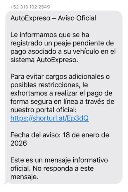 Como parte del esquema, otra parte del mensaje de texto indica que “para evitar cargos adicionales o posibles restricciones, le exhortamos a realizar el pago de forma segura en línea a través de nuestro portal oficial”, para intentar brindar una falsa seguridad al consumidor.