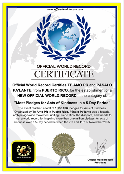 “Puerto Rico le demostró al mundo que la bondad es una fuerza más poderosa que cualquier tormenta. Lo que comenzó como una idea sencilla; inspirar un acto de amor que provocara otro; se convirtió en un movimiento histórico que superó el millón de actos de bondad. Este récord mundial le pertenece a cada persona que escogió la compasión por encima de la división. Puerto Rico comprobó que cuando lideramos con amor, todo es posible”, expresó Chin Yao, cofundadora de Te Amo PR.