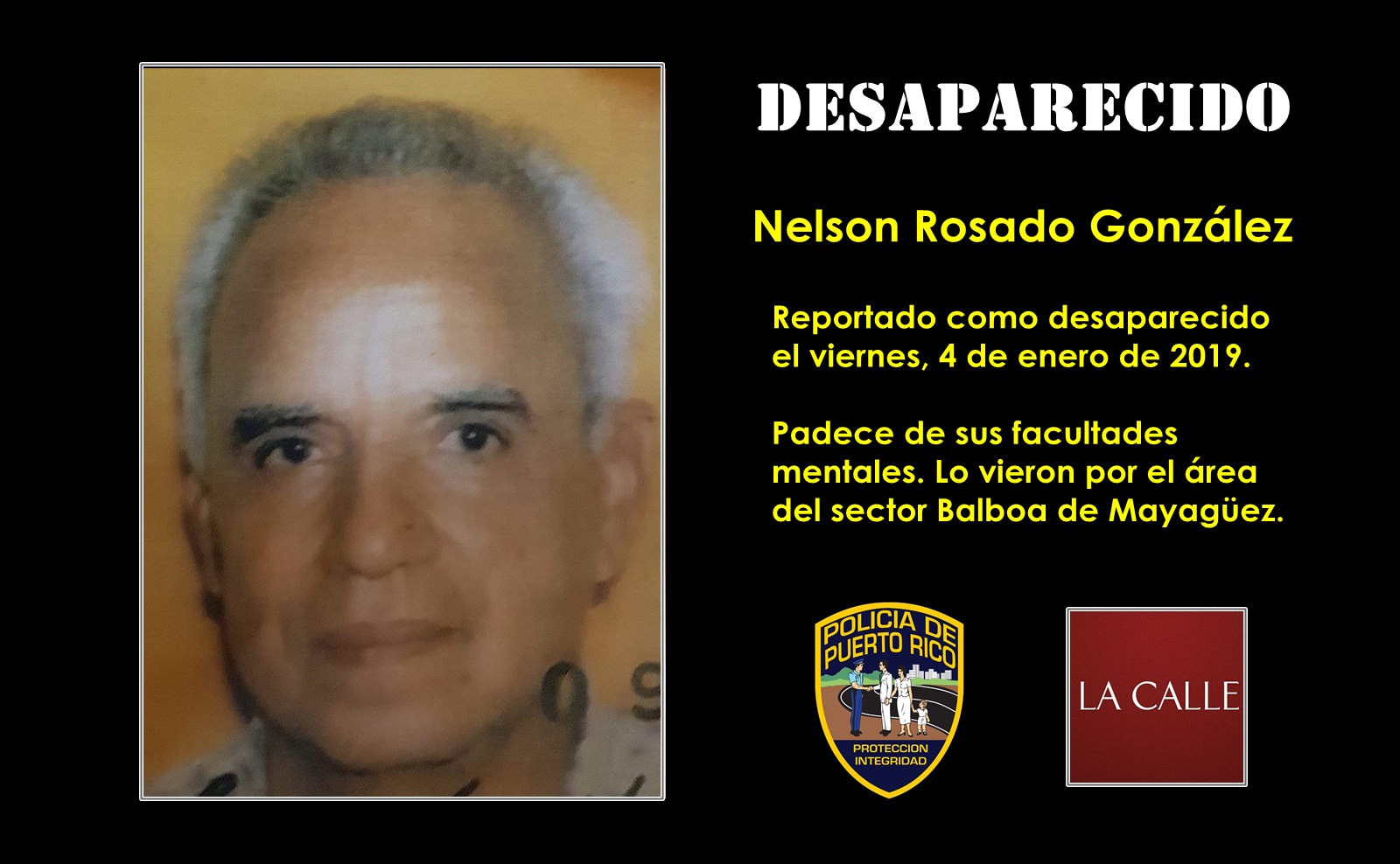 Según el agente Iván Plumey, de la Oficina de Prensa, Rosado González padece de sus facultades mentales y fue visto por última vez por su hijo, el 3 de diciembre de 2018, en su residencia ubicada en la calle Betances del barrio París, en Mayagüez.