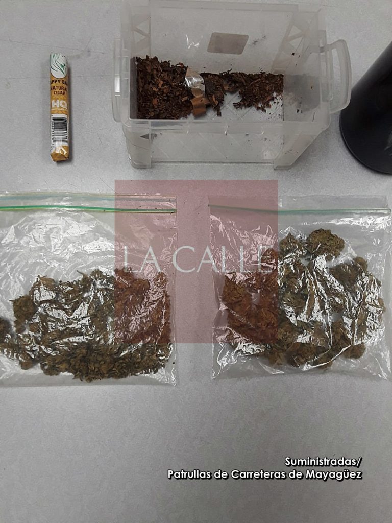 Mientras, a las 5:40 de la tarde, Josué De la Rosa Soler, de 25 años, un empleado de mantenimiento vecino de Mayagüez, fue arrestado por la posesión de un cigarrillo de marihuana, mientras se encontraba en la parada de carros públicos, frente al antiguo residencial Marini, en la carretera 106.