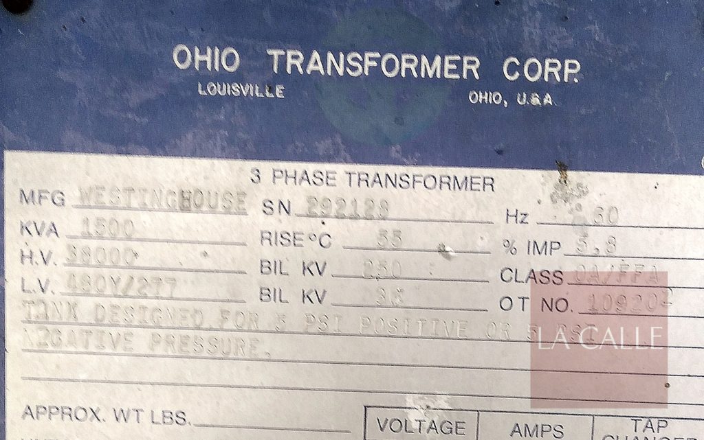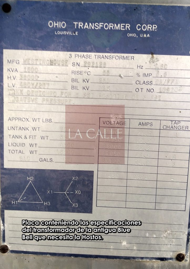 Se sabe que el transformador de la antigua Blue Bell cumple con las especificaciones exactas (1,500 KVA, primaria 38,000 delta y secundaria 480/277 estrella), para reemplazar el transformador averiado de la escuela Hostos.