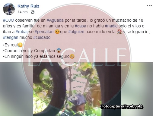 “OJO, observen, fue en Aguada por la tarde. Lo grabó un muchacho de 18 años y es familiar de mi amiga. Y en la casa no había nadie, solo él y los que iban a robar. Se percatan que alguien hace ruido en la casa y se logran ir. Tengan mucho cuidado. Es real. Corran la voz y compartan. En ningún lado ya estamos seguros”, escribió una joven de nombre Kathy Ruiz en su cuenta de Facebook, que publicó el video en su muro y le pidió a la gente que lo compartiera.
